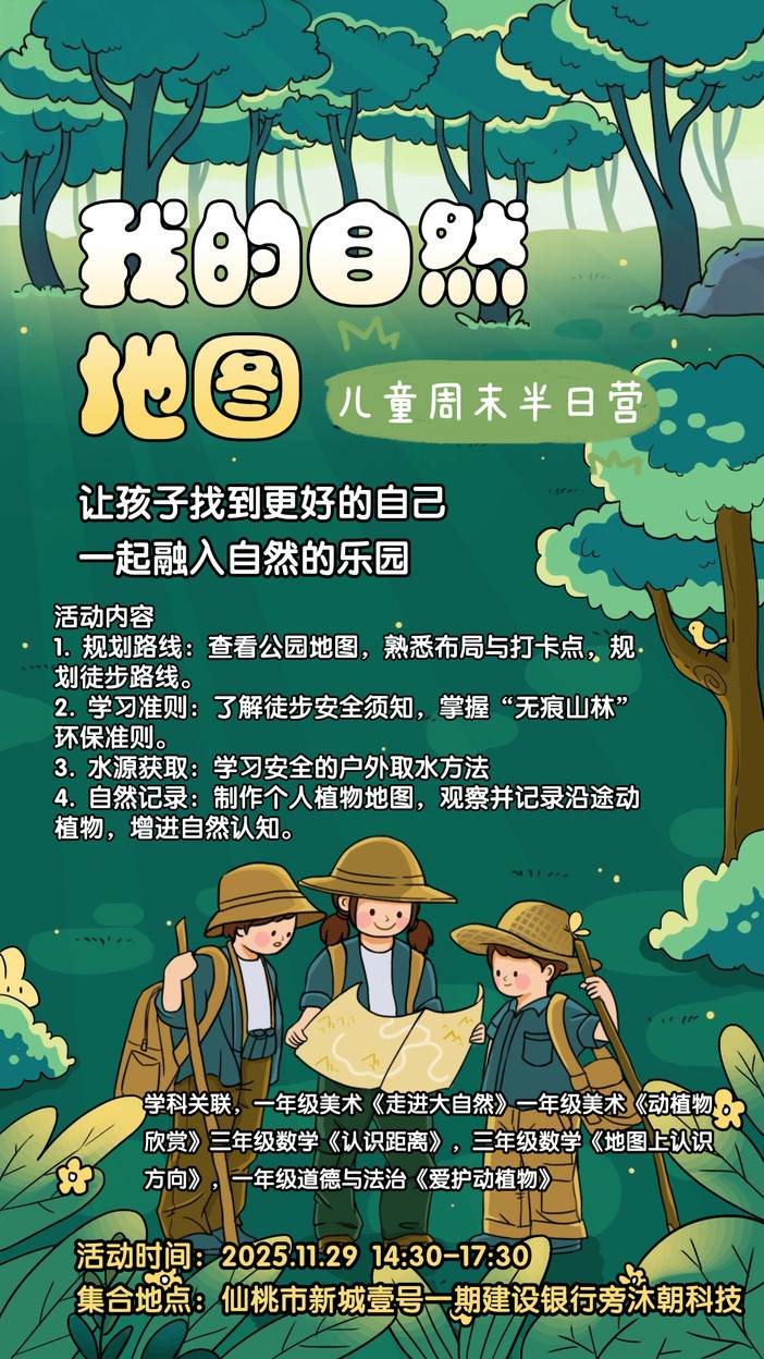 自然,是孩子需要的成长课堂!本周自然课, 沐朝邀孩子共绘《我的自然地图》 自然孩子需要的成长课堂 从6岁到14岁,每一步探索都在为未来奠基。又是一个周末将至,你是否也在思考:如何让孩子不再留恋屏幕,走进自然?对6-14岁的孩子来说,自然不是遥远的风景,而是触手可及的成长乐园。在这关键的九年里,每个年龄段都能在自然中找到独特的成长养分。自然教育:每个年龄都有独特的打开方式6-8岁:在游戏中学习规则与协作小学...