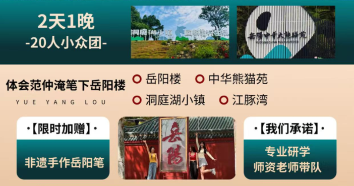 这个六一,趁孩子还没长大 让他们来近距离接触下熊猫吧。 岳阳中华熊猫苑熊猫研学 应该是一份孩子喜欢的六一礼物吧。 那就让我们以岳阳中华熊猫苑熊猫研学游为契机 同时去领略下三大名楼,岳阳楼的风采。 诗与远方,就在这个六一 来看“洞庭天下水,岳阳天下楼”的壮丽景色 和感受“江豚跃浪、渔歌唱晚”的生态之美 六一,欢迎来和我们一起出发 这个六一,给孩子一场“行走...